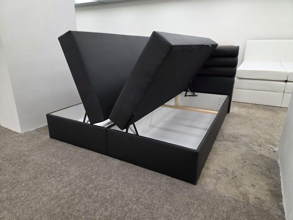 Potah koženka. 2x úložný prostor, včetně topperu. Lůžko 180x200 cm, výška lůžka 58 cm, čelo: 107x185 cm.