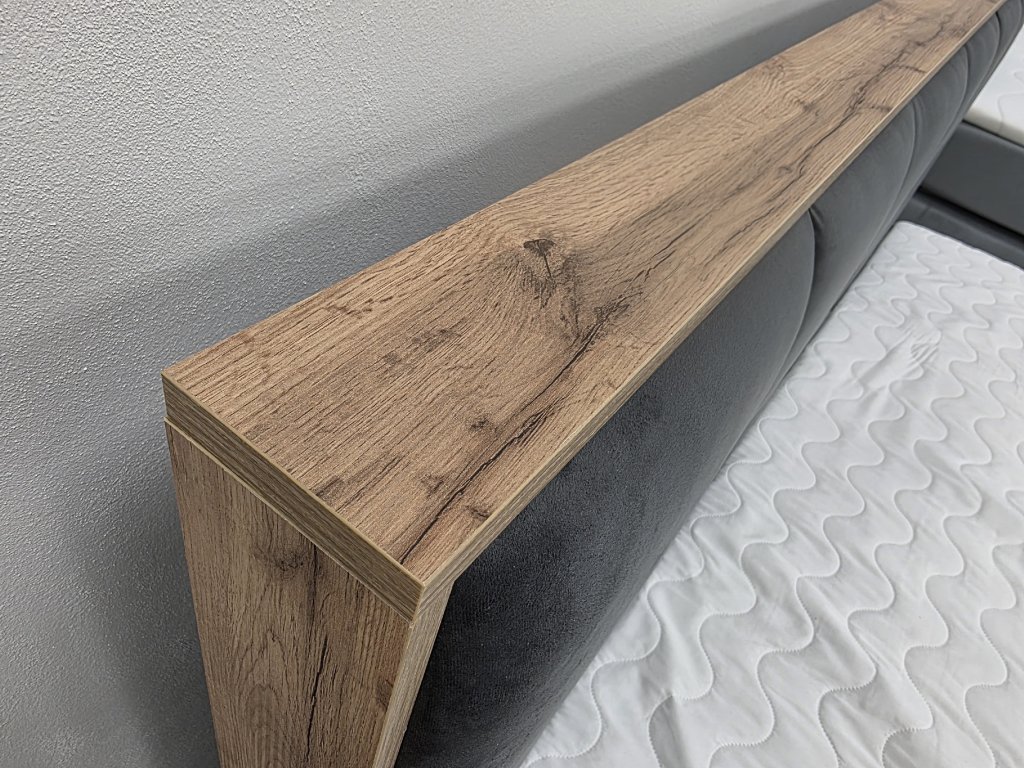 Potah semiš kombinace lamino. 2x úložný prostor, včetně topperu. Lůžko 180x200 cm, výška lůžka 53 cm, čelo: 105x189 cm.