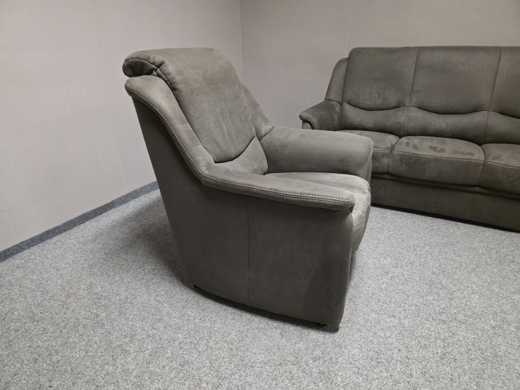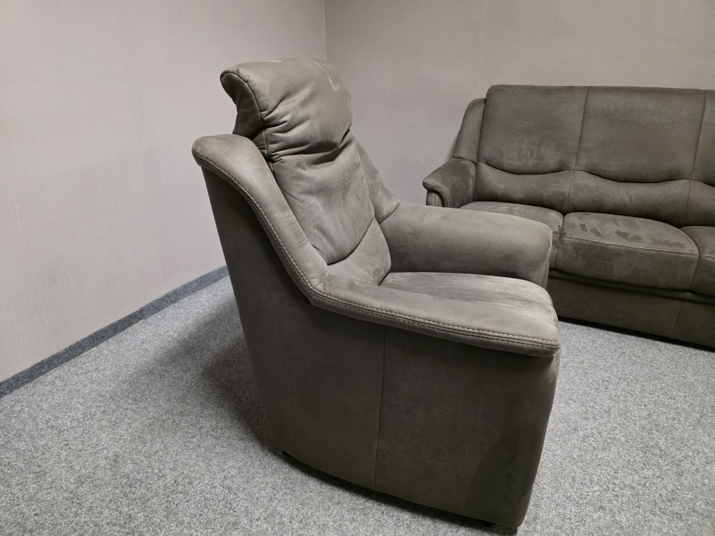II. jakost (oděrka u křesla viz foto). Potah vysoce kvalitní látka, celočalouněné. Značka DIETSCH. Nerozkládací, u křesla polohovací opěrka hlavy. Gauč: délka 175 cm, hloubka 85 cm, výška 98 cm, výška sedáku: 46 cm, plocha sedáku: 55x145 cm.
