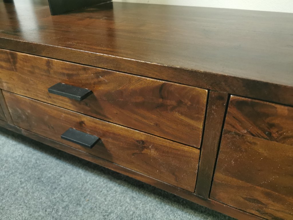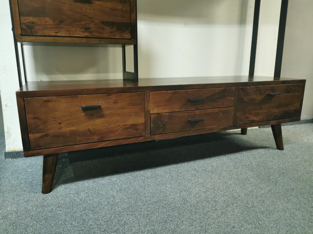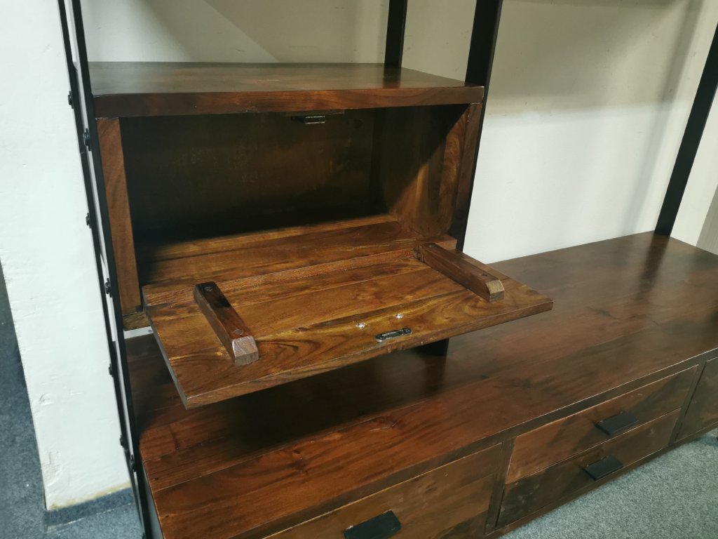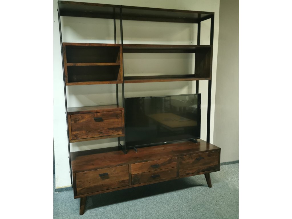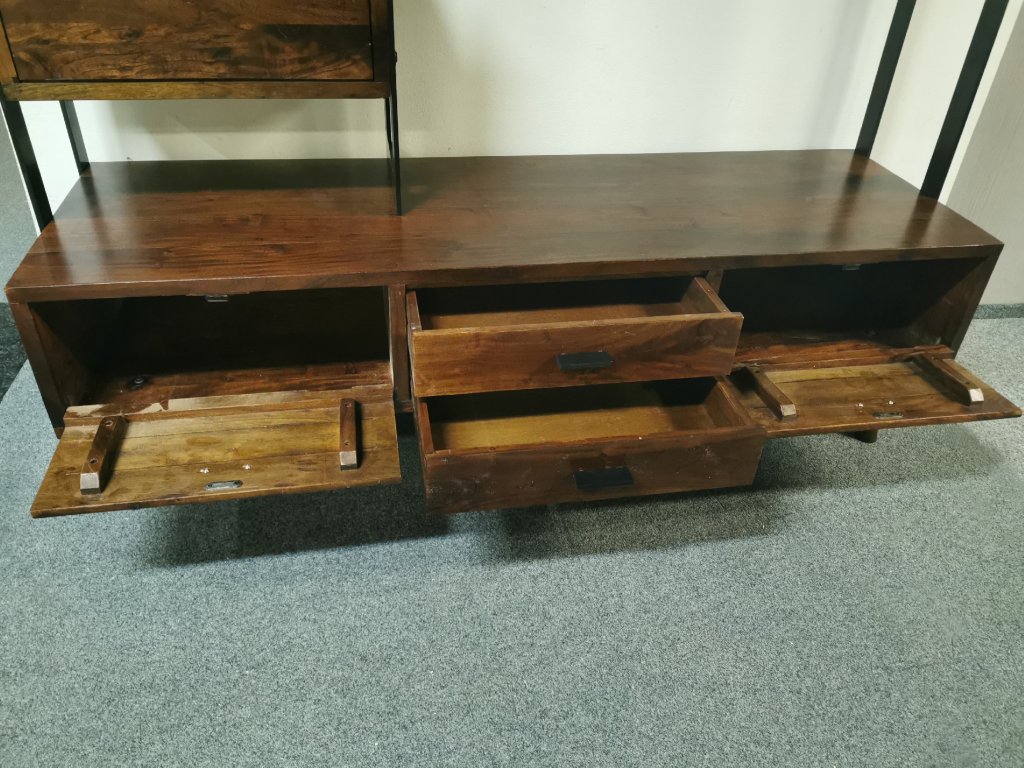 Materiál masiv akát lakovaný, masivní železná konstrukce. Běžná cena 30.000,-Kč.2 šuplíky, 3 výklopná dvířka. K dispozici více kusů. Délka 163 cm, hloubka spodku: 50 cm, hloubka vršku: 30 cm, výška 196 cm. Prostor pro TV: šířka 104 cm, výška 74 cm. 2/95,35,170/140