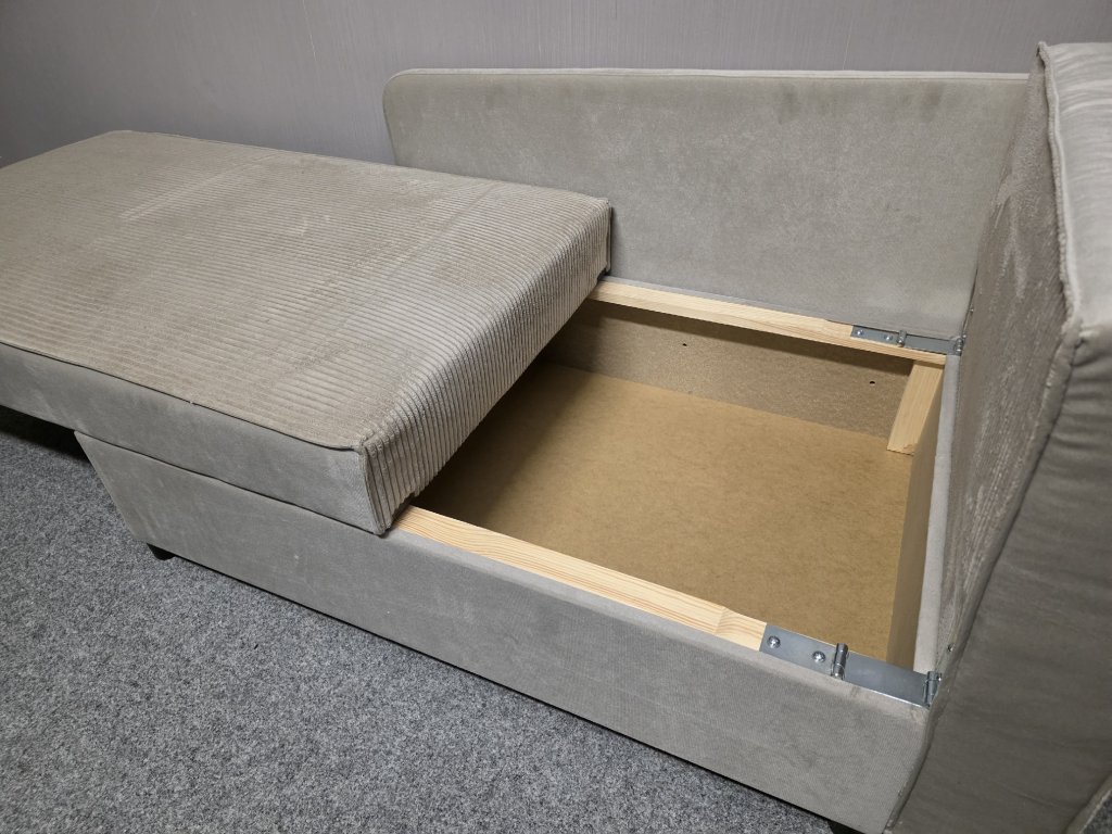 Potah látka, celočalouněné. Rozkládací, úložný prostor. Cena s polštáři. Délka 149 cm, šířka 85 cm, výška 75 a 86 cm, lůžko: 80x203 cm, výška sedáku: 44 cm. 140,80,45/60