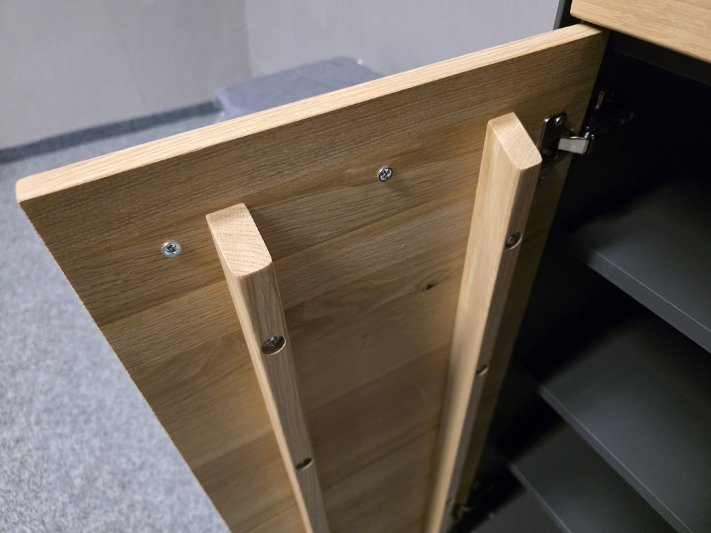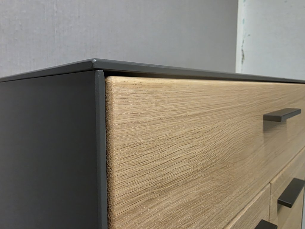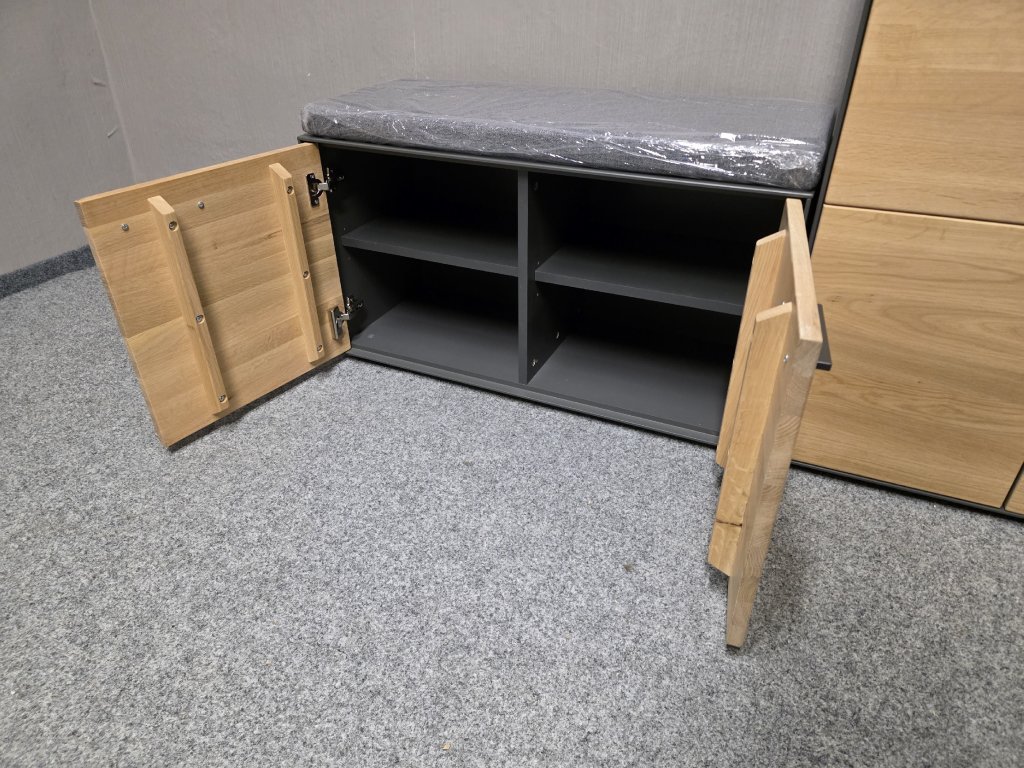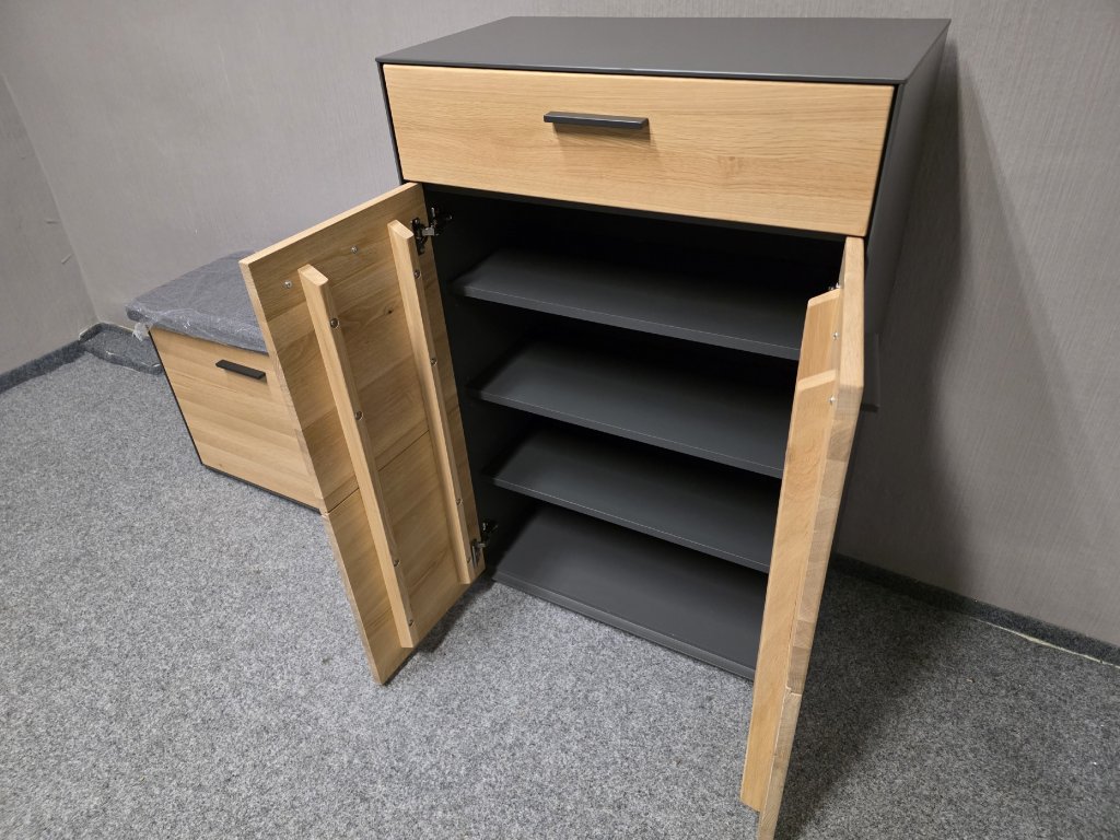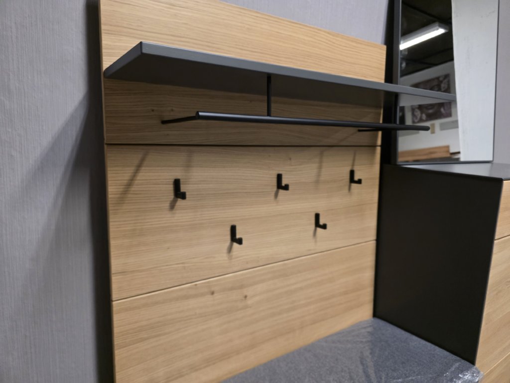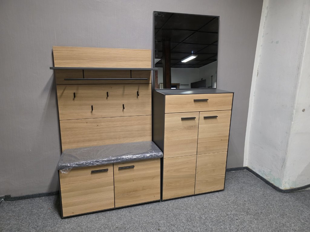 Materiál: masiv dub, vysoce kvalitní lamino. Dvířka a šuplík s tlumením zavírání. Značka CONTORTE. Cena za komplet. Komoda: šířka 71,5 cm, hloubka 37 cm, výška 108 cm. Lavice: šířka 89,5 cm, hloubka 37 cm, výška 53 cm. Věšák: šířka 89,5 cm, hloubka 28 cm, výška 100,5 cm. Zrcadlo: 71,5 x 75 cm. 800P