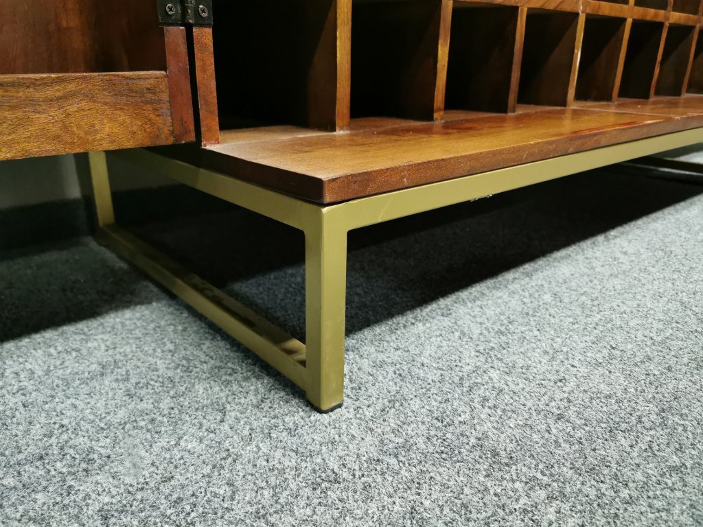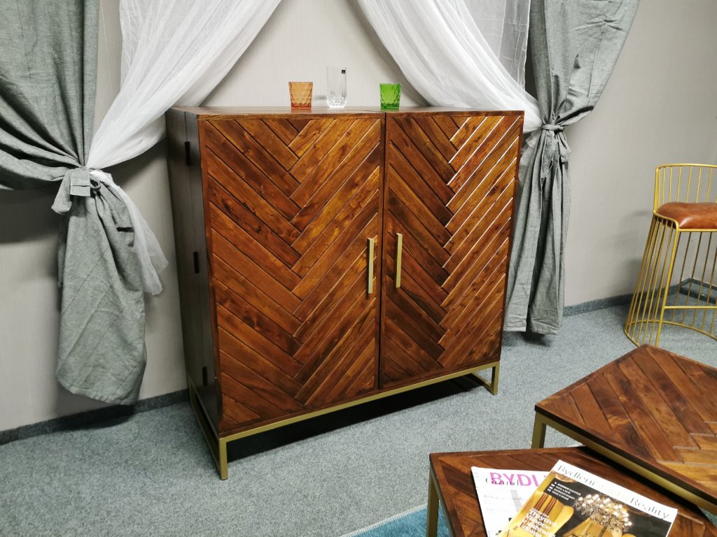 Materiál masiv akát, nohy kov. 2 dvířka, 2 šuplíky, držáky na sklenice a lahve. Šířka 110cm, hloubka 52cm, výška 110cm.