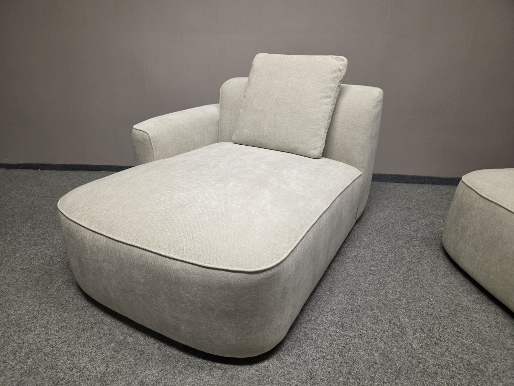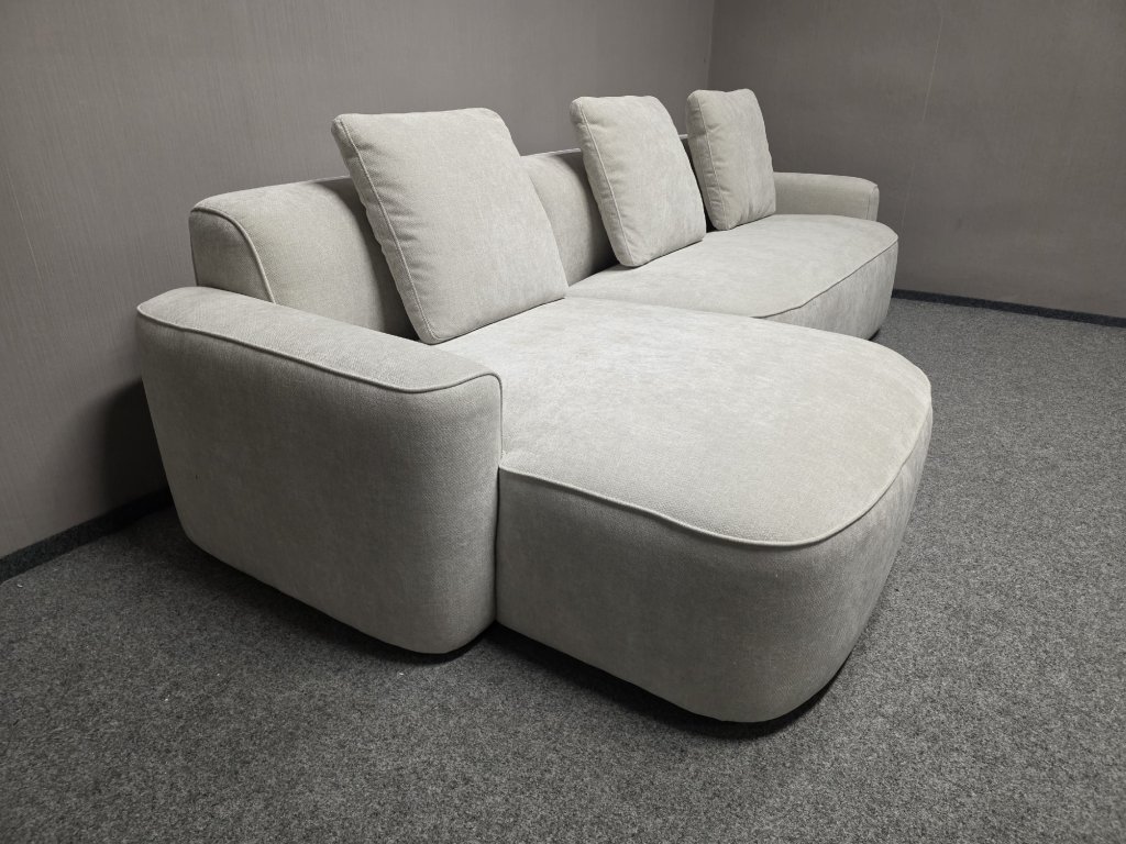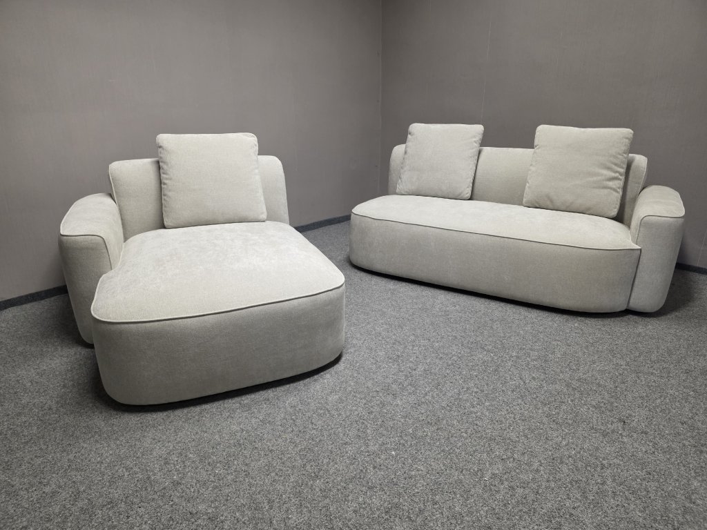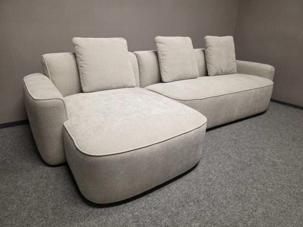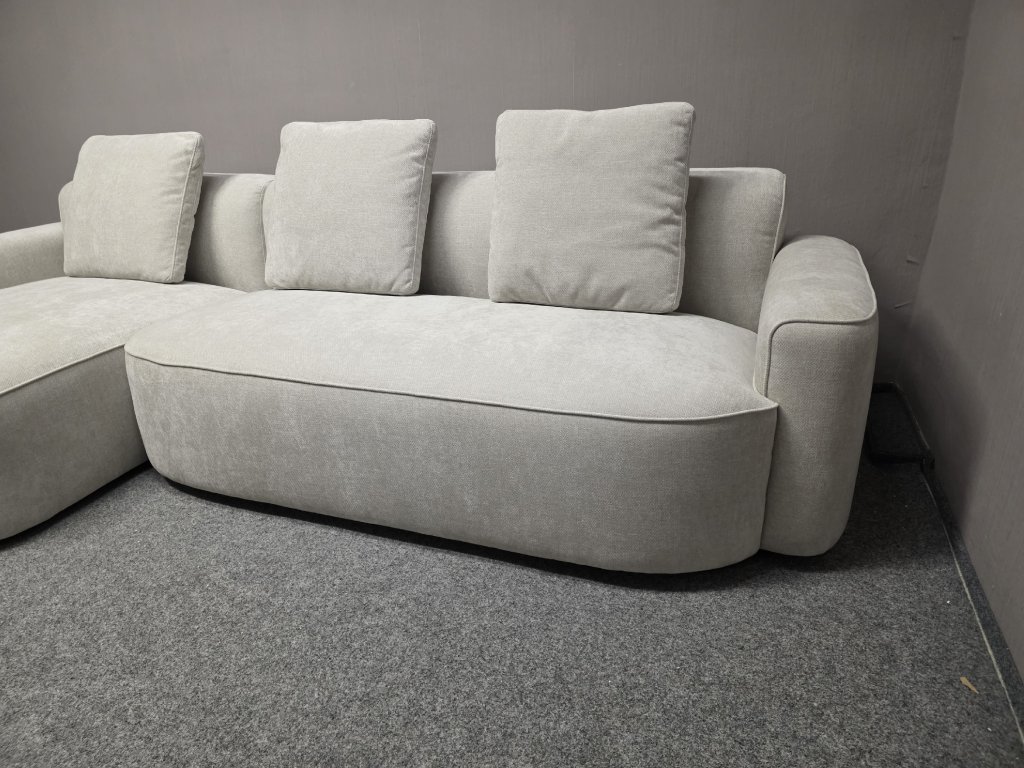 Potah látka 100% polyester, celočalouněné. Nerozkládací, lze postavit samostatně. Cena s polštáři. Zleva: 140x295 cm, výška 73 a 92 cm, výška sedáku: 44 cm, hloubka sedáku: 50-68 cm. Levý gauč: 112x140 cm. Pravý gauč: 100x183 cm.