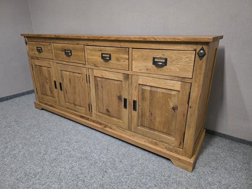 Materiál masiv dub, doplňky kov. Bohatě zdobená stylová skříňka. 4 šuplíky. 4 dvířka. Délka 195 cm, hloubka 50cm, výška 90 cm.