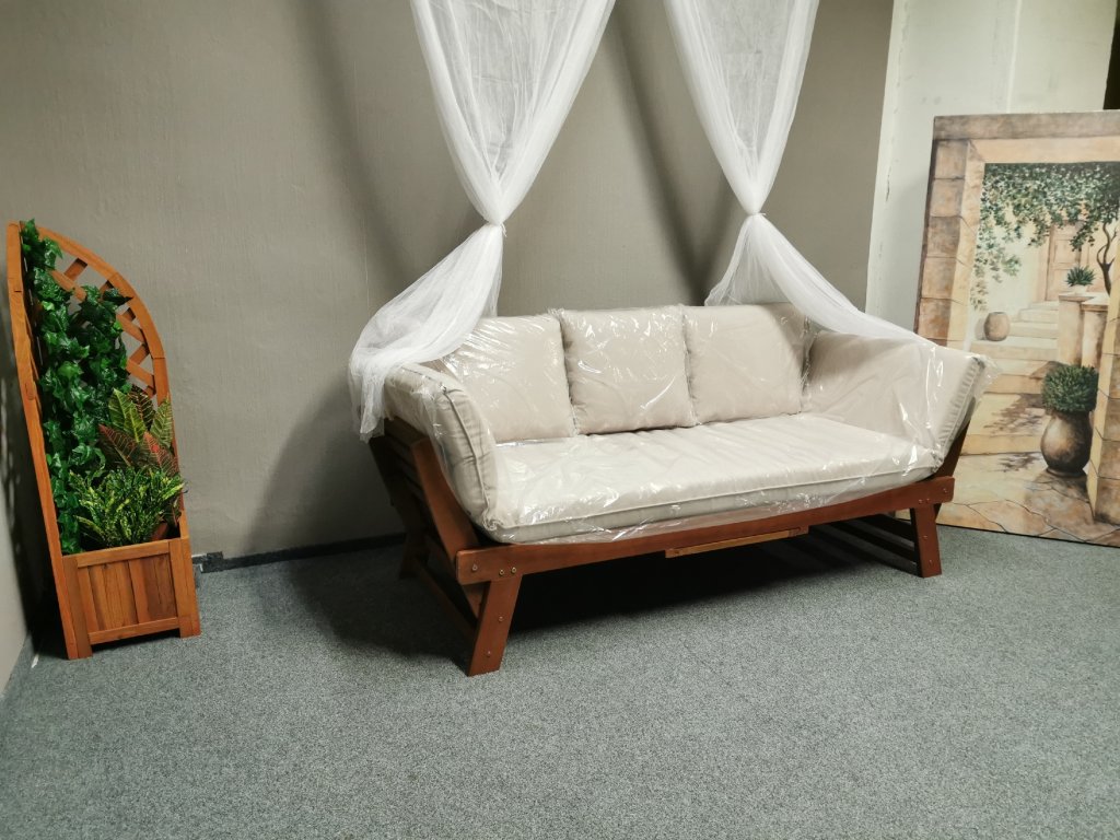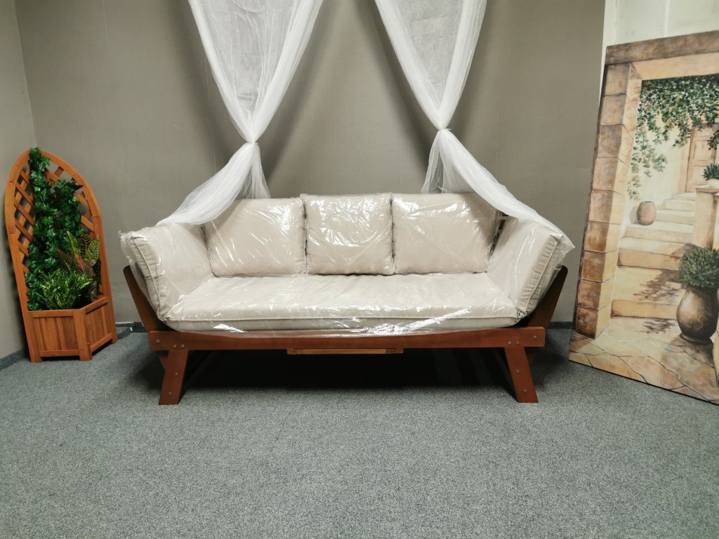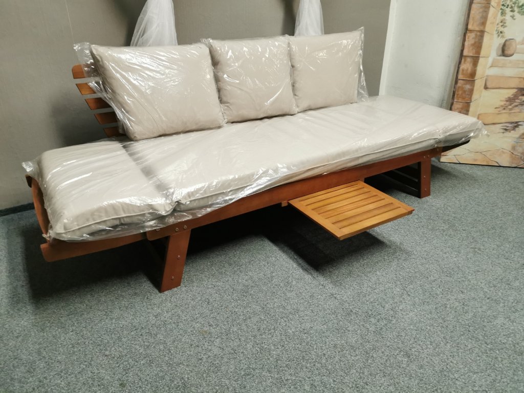 Materiál masiv eukalyptus, potah polyester. Značka YORKSHIRE. Výsuvný stolek. K dispozici více kusů. Nosnost 220kg. Délka 180 cm, hloubka 80 cm, výška 76 cm, výška sedáku: 41 cm, délka po rozložení: 218 cm. 1/180,70,45/65