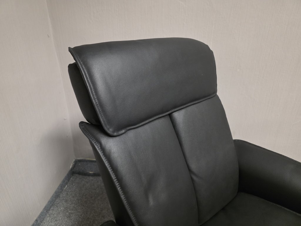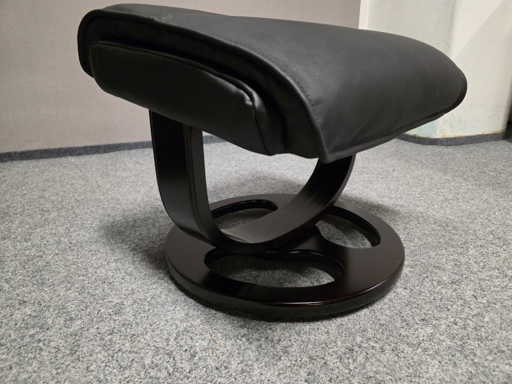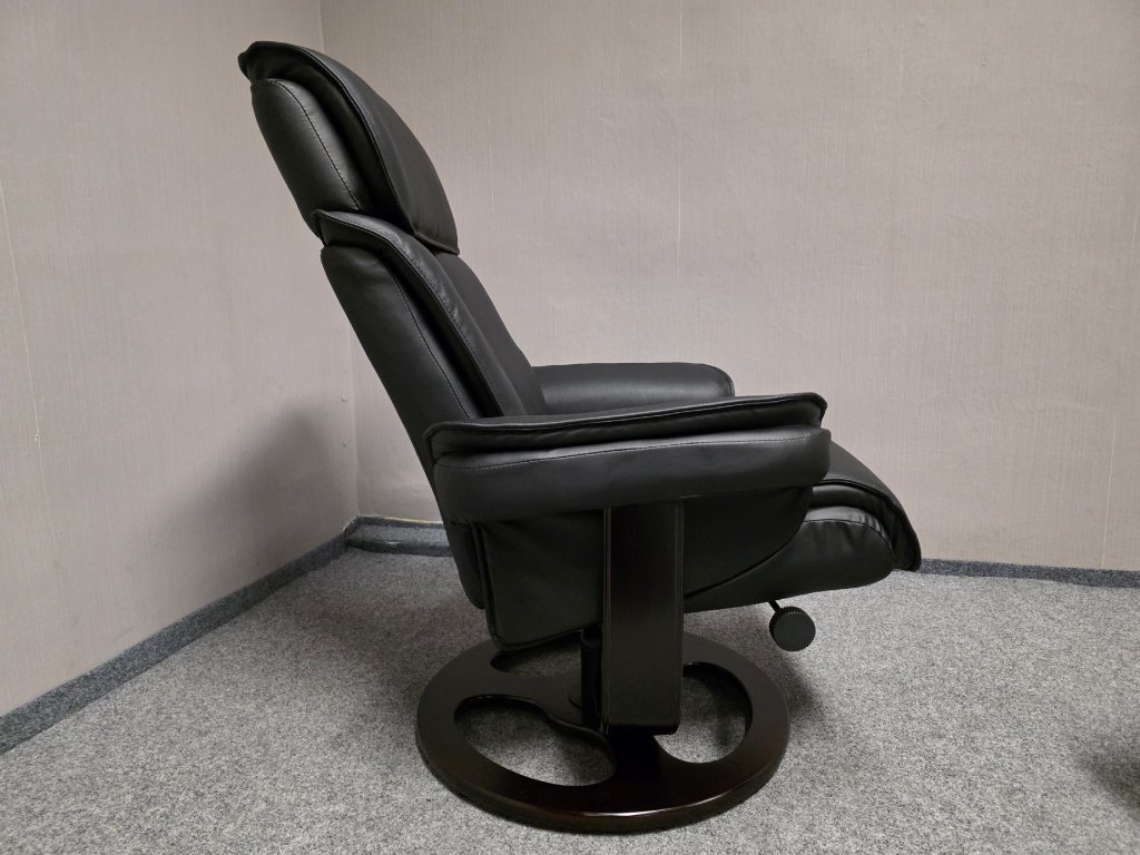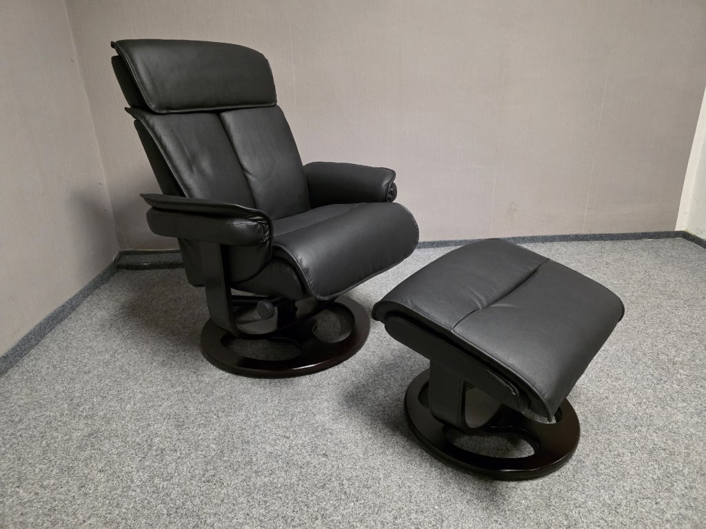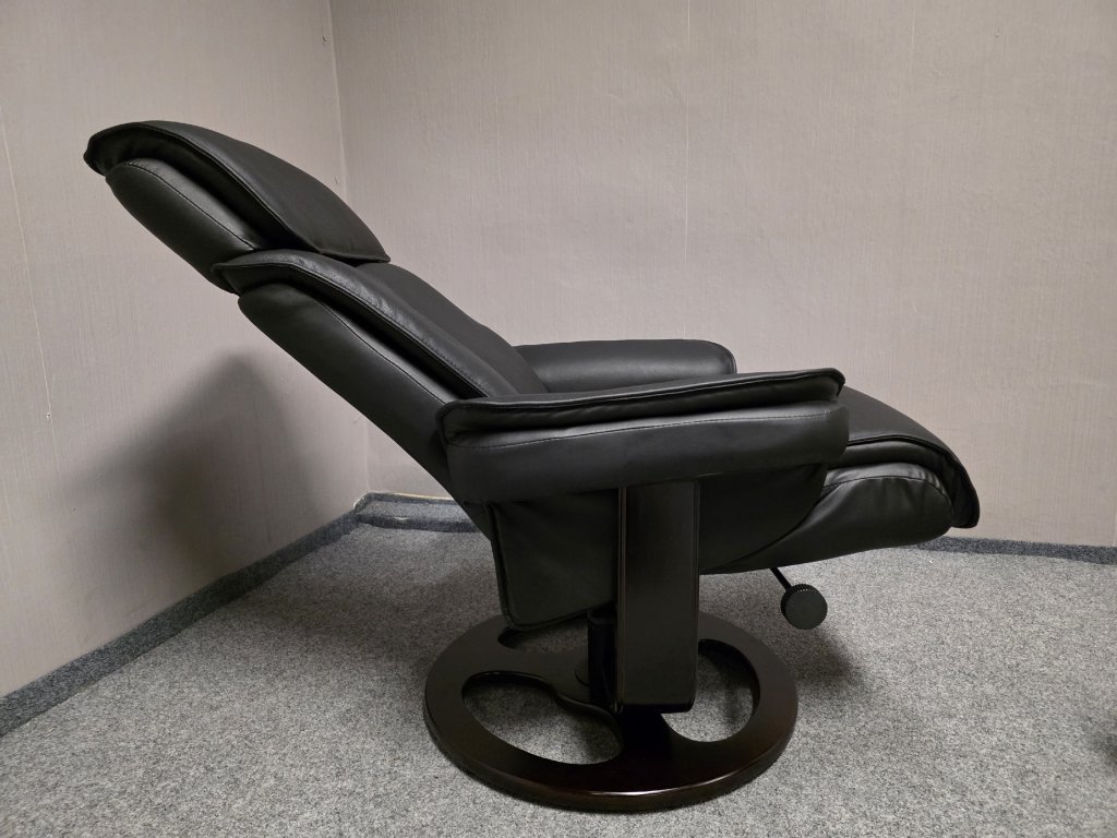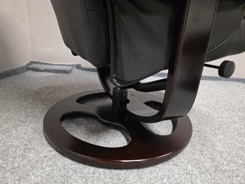 Potah kůže, koženka. Podesta masiv třešeň. Otočné, manuálně polohovací. Křeslo: šířka 80 cm, hloubka 82 cm, výška 107 cm, výška sedáku: 47 cm, hloubka sedáku: 51 cm. Taburet: 48x55 cm, výška 46 cm. 500P