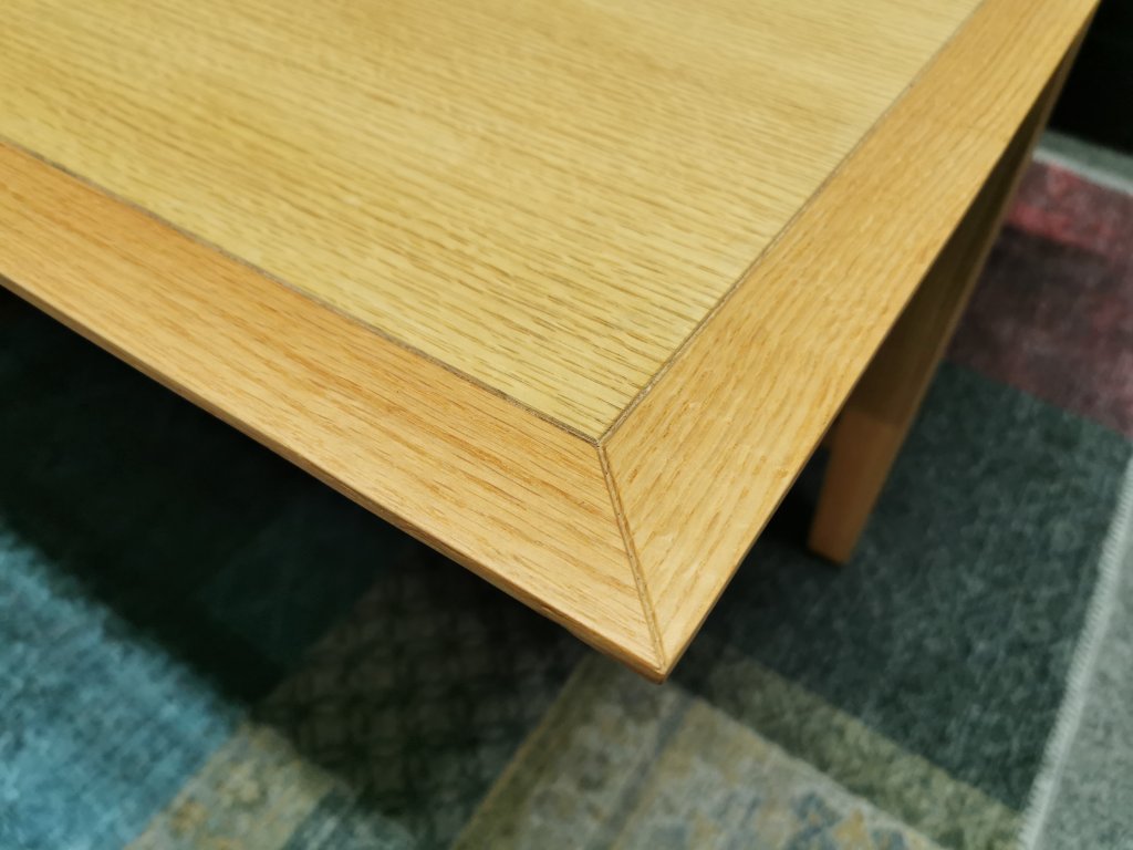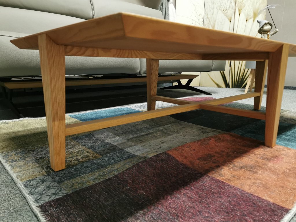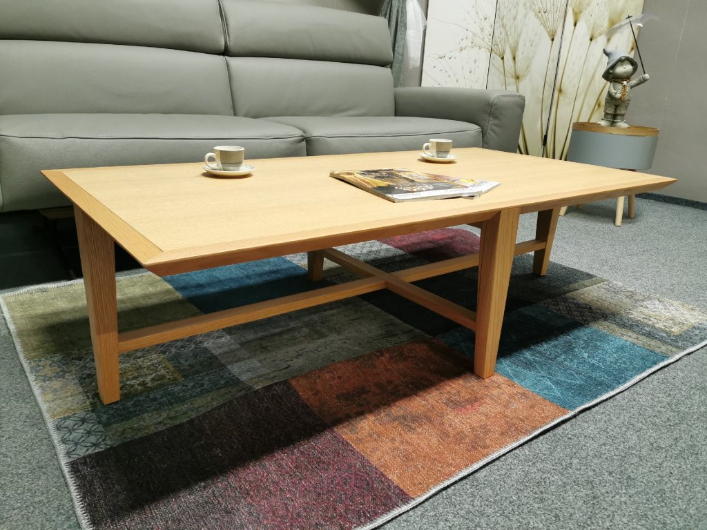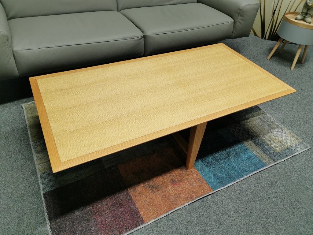 II. jakost (výstavní kus). Materiál masiv dub, deska dýhované lamino. 70x140 cm, výška 40 cm.