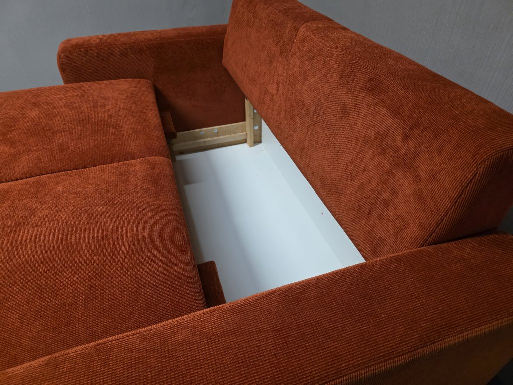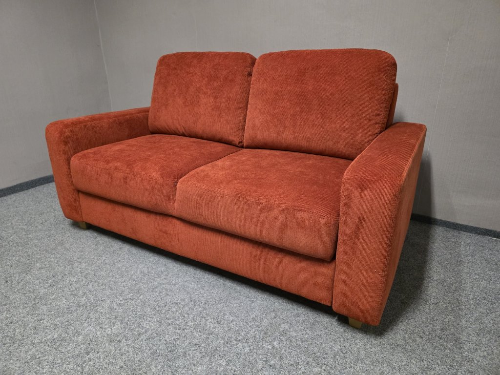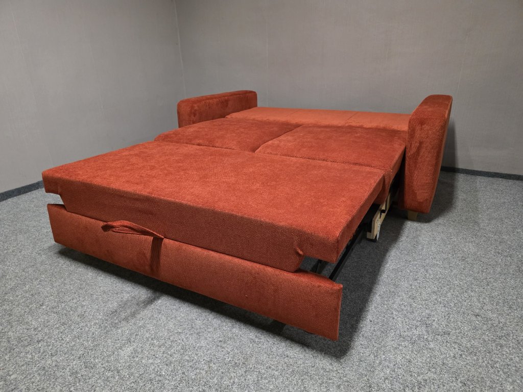II. jakost (oděrka při rozložení viz foto). Potah látka, celočalouněné. Rozkládací, úložný prostor. Délka 174 cm, hloubka 95 cm, výška 81-95 cm, lůžko: 140x205 cm, výška sedáku: 49 cm, hloubka sedáku: 58 a 74 cm.