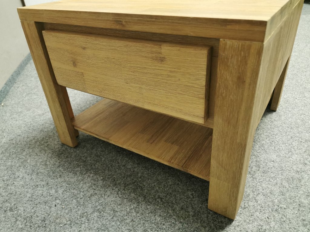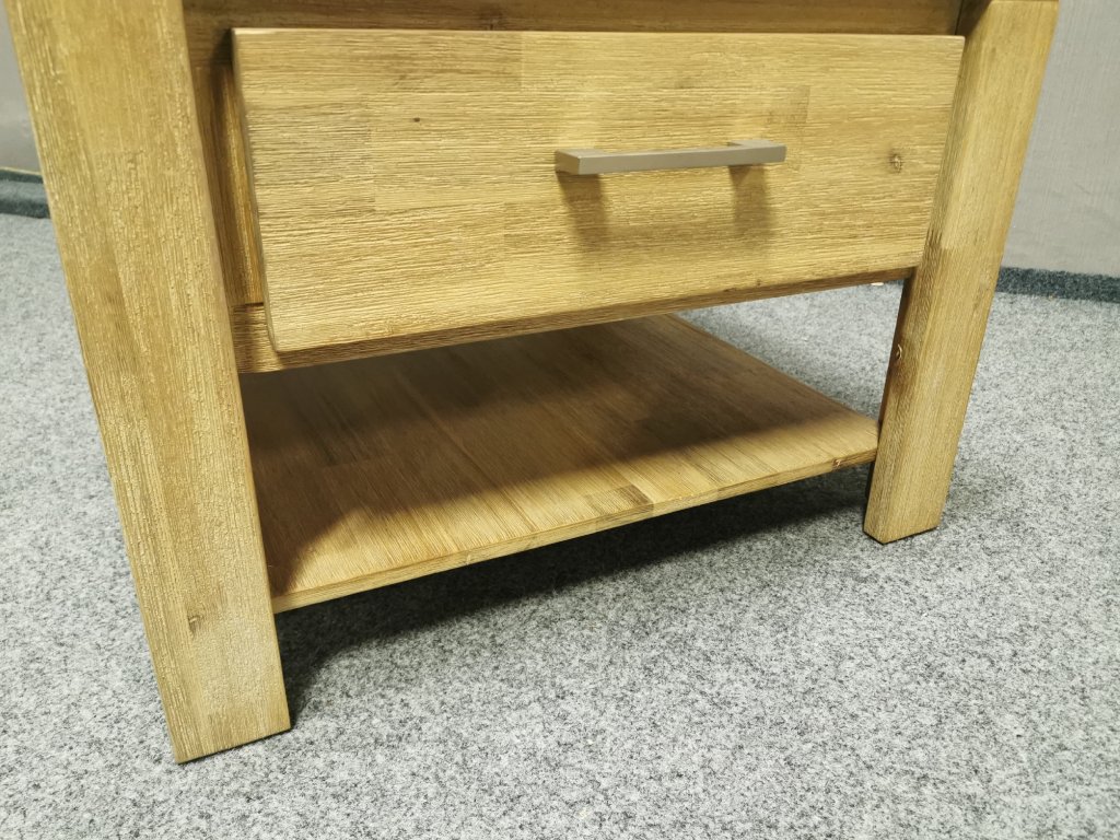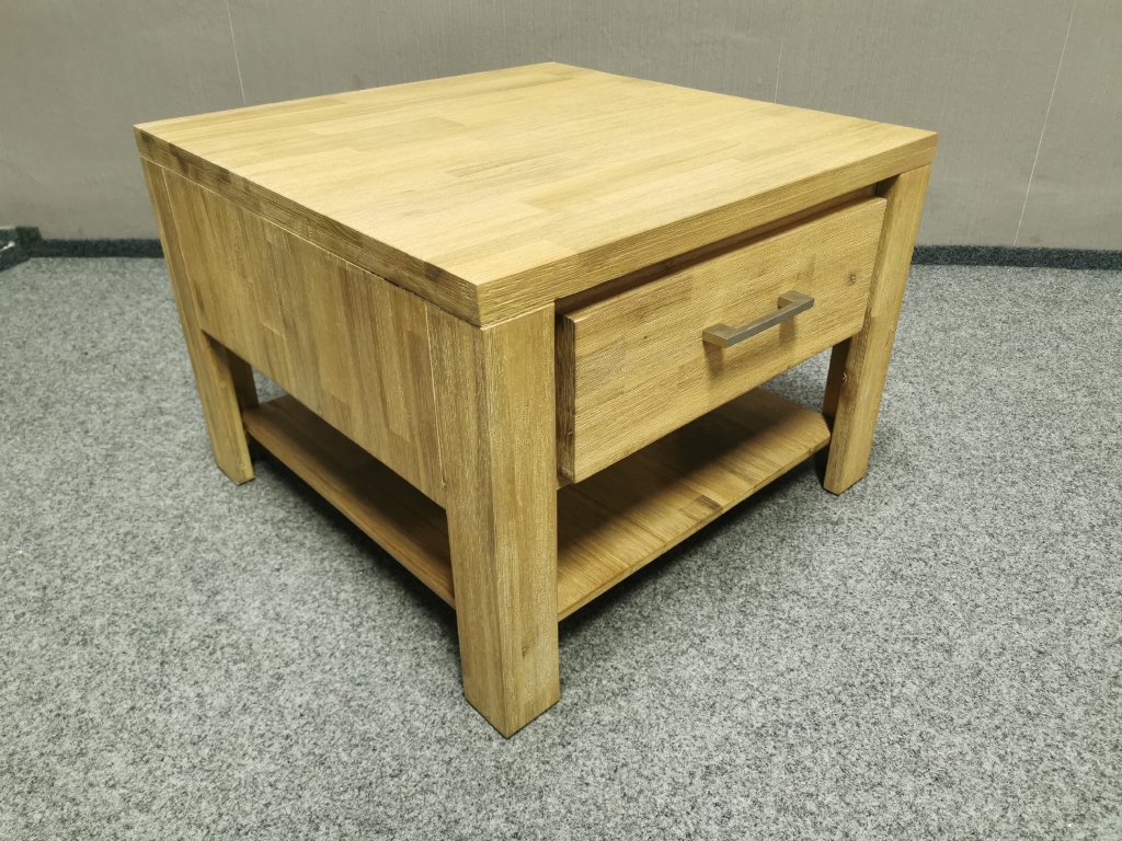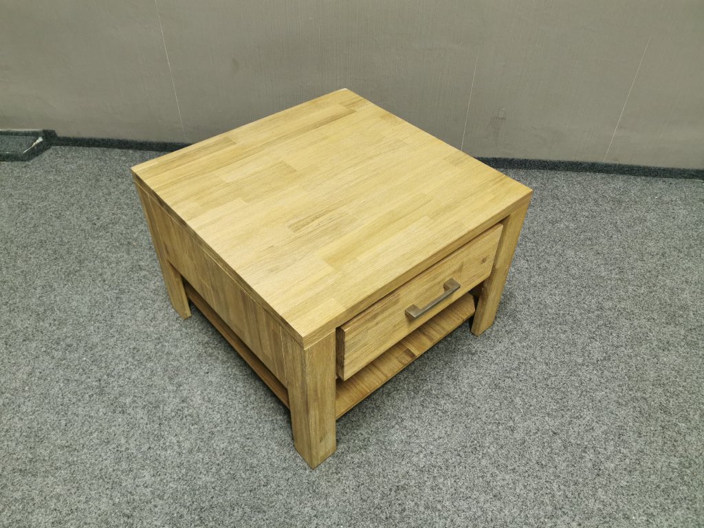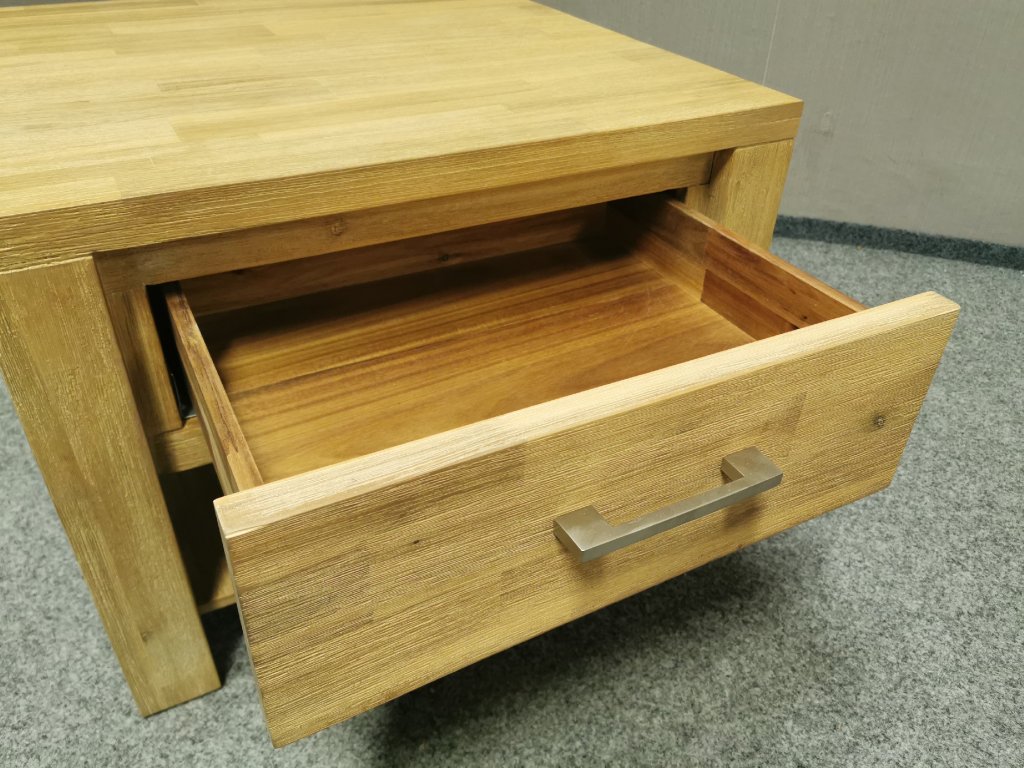 II. jakost (vystavený kus). Materiál komplet dřevo - drátkovaný akát. 1 šuplík s tlumením zavírání. 65 x 65 cm, výška 47 cm. 500P