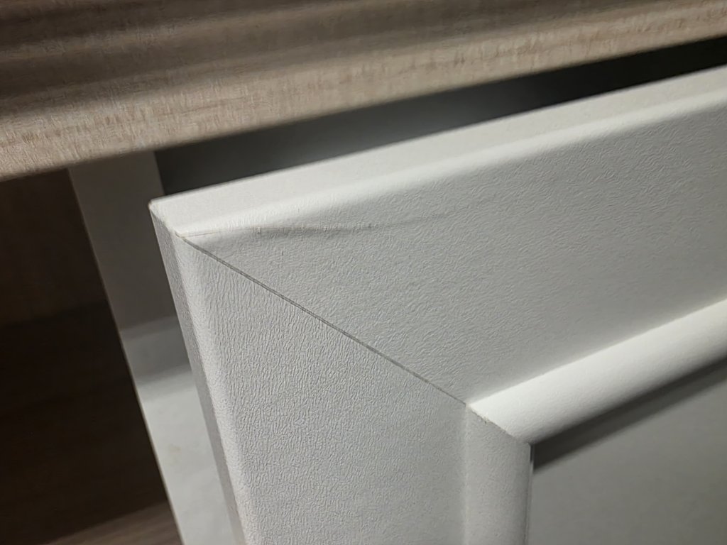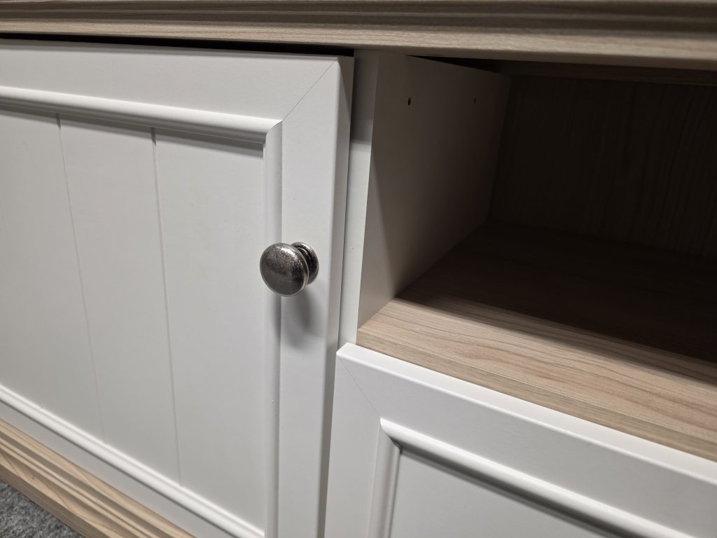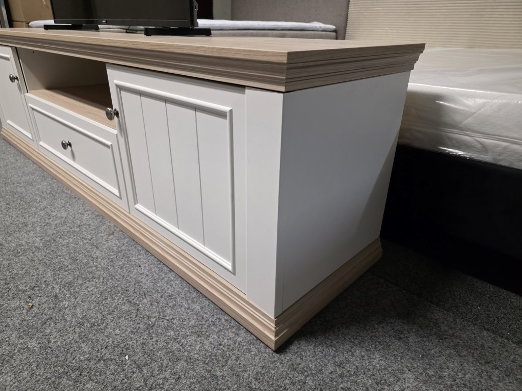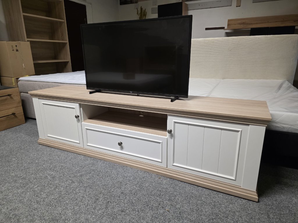 II. jakost (oděrka viz foto). Materiál lamino, MDF mat. Dvířka a šuplík s tlumením zavírání. Délka 199 cm, hloubka 44 cm, výška 54 cm. 200,45,30/65