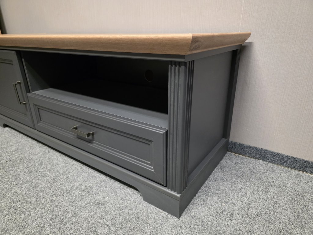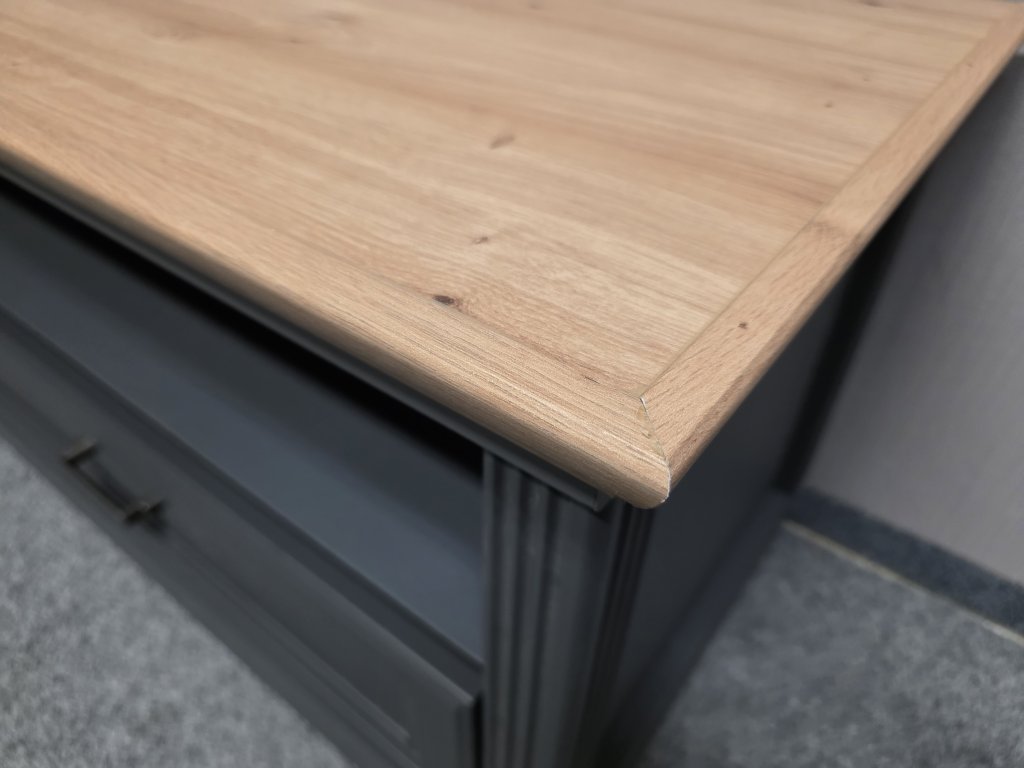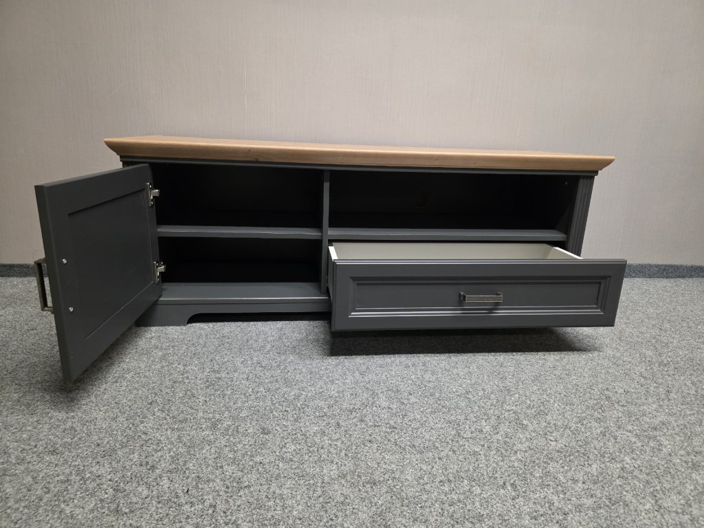 Materiál lamino, MDF. Dekor: dub artisan, grafit. (vystavený kus). Šuplík s tlumením zavírání. Délka 143 cm, hloubka 51 cm, výška 54 cm. 400P